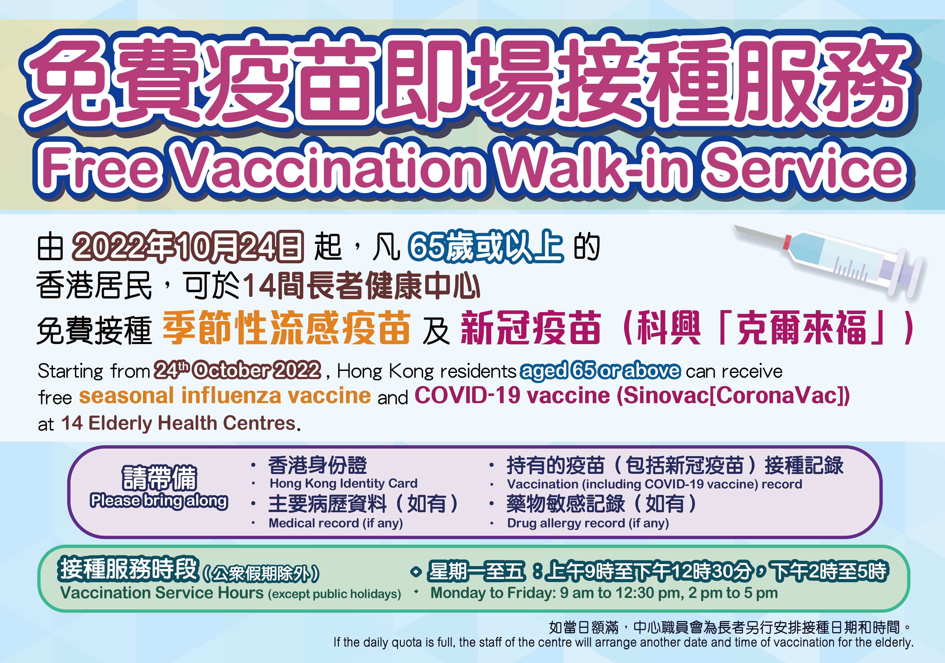 Starting from 4 October 2024, 14 Elderly Health Centres provide mRNA COVID-19 vaccine to elderly aged 65 years or above. Booking is required.