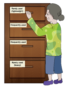 - When storing objects, those that are frequently used should be put on shelves between shoulder to waist height for easy access and transfer. Heavy and light objects which are rarely used should be put on the lower and upper shelves respectively.
