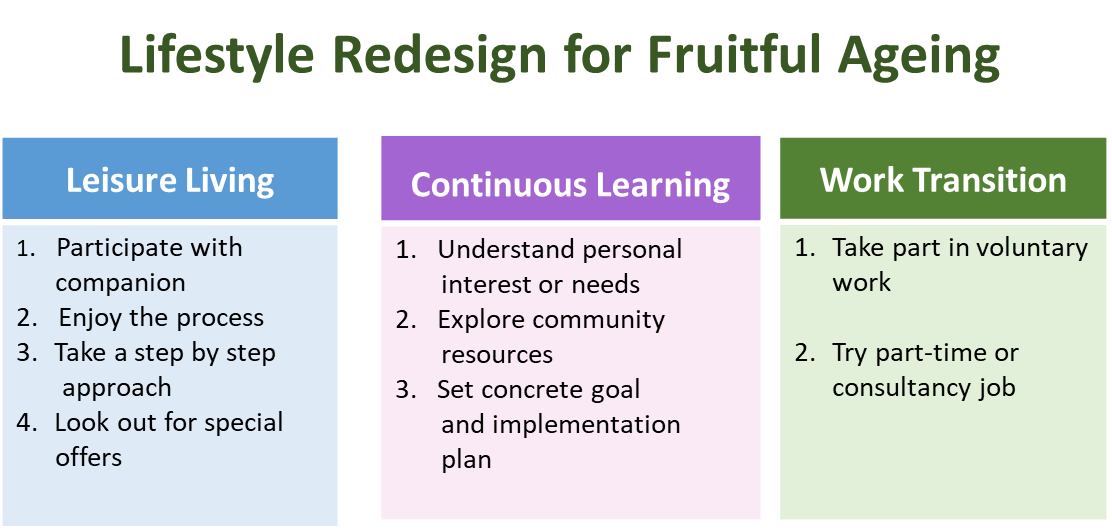 Elderly persons can achieve a more enjoyable life through lifestyle redesign by “Leisure living”, “Continuous learning” and “Work transition”. Actively participating in meaningful activities and interacting with others can make life more fulfilling.