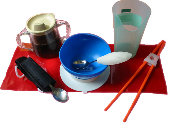 - 例如:粗手柄的匙羹或叉、筷子辅助器、高边的碗(容易勺起食物)、剪口杯(附图一)