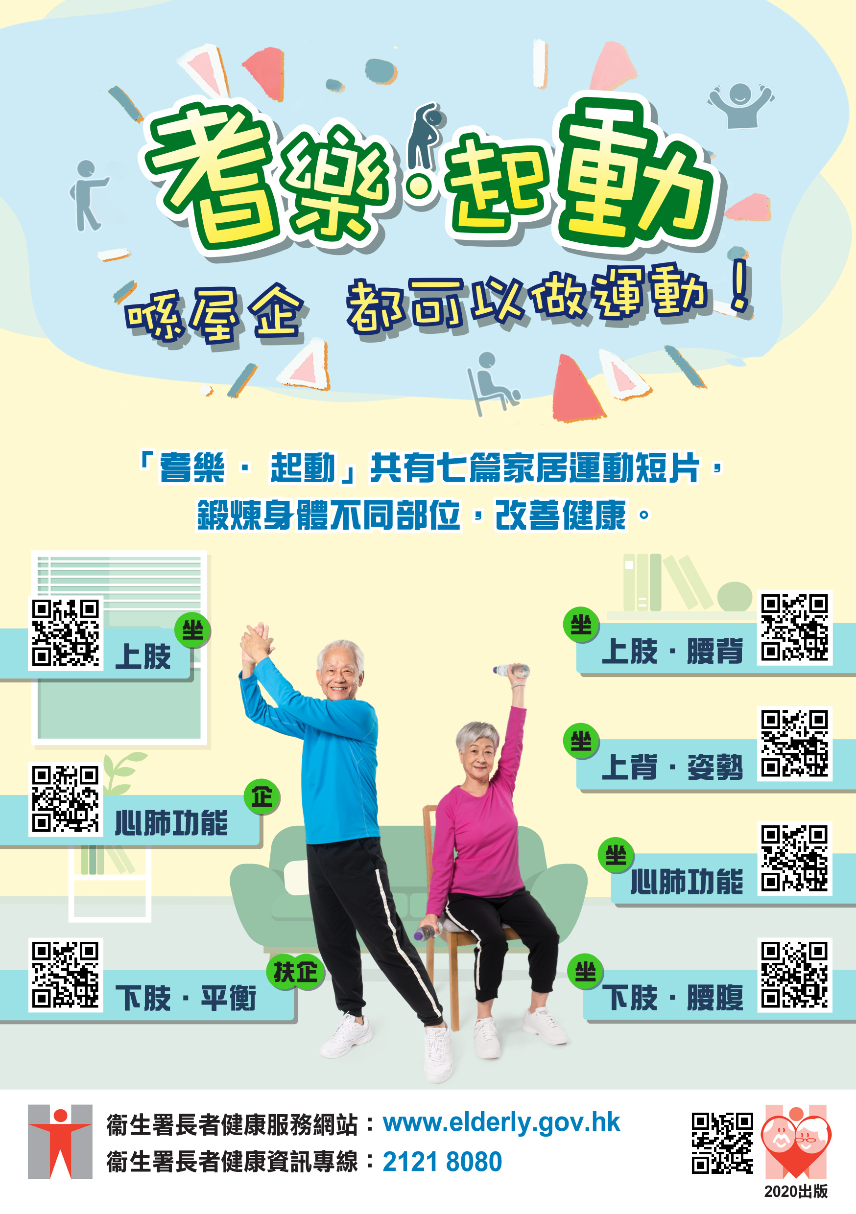 體能活動篇 「耆樂.起動」 「耆樂·起動」是由衞生署長者健康服務製作的家居運動短片系列,讓長者身處家中亦能有效及安全地進行體能活動。這系列的七套運動由物理治療師設計和示範,能夠鍛煉不同的身體部位,改善健康,並適合不同活動能力的長者。長者可因應個人的能力,選擇合適的片段,跟著示範動作,進行運動。長者們,以後「喺屋企都可以做運動」! 長者康健在屋邨 X 耆樂.起動宣傳短片 為鼓勵長者保持活力和身體健康,衞生署與香港房屋委員會聯合拍攝一輯宣傳短片,向屋邨長者居民推介《耆樂‧起動》家居運動短片系列,方便他們在家跟隨短片隨時做運動 。 「耆樂‧起動」家居運動短片 上肢篇(坐) [下載短片文字內容] [無障礙瀏覽版本] [無障礙版本文字內容] 上背‧姿勢篇(坐) [下載短片文字內容] [無障礙瀏覽版本] [無障礙版本文字內容] 上肢‧腰背篇(坐) [下載短片文字內容] [無障礙瀏覽版本] [無障礙版本文字內容] 下肢‧腰腹篇(坐) [下載短片文字內容] [無障礙瀏覽版本] [無障礙版本文字內容] 下肢‧平衡篇(扶企) [下載短片文字內容] [無障礙瀏覽版本] [無障礙版本文字內容] 心肺功能篇(坐) [下載短片文字內容] [無障礙瀏覽版本] [無障礙版本文字內容] 心肺功能篇(企) [下載短片文字內容] [無障礙瀏覽版本] [無障礙版本文字內容] 「耆樂.起動」二維碼宣傳單張