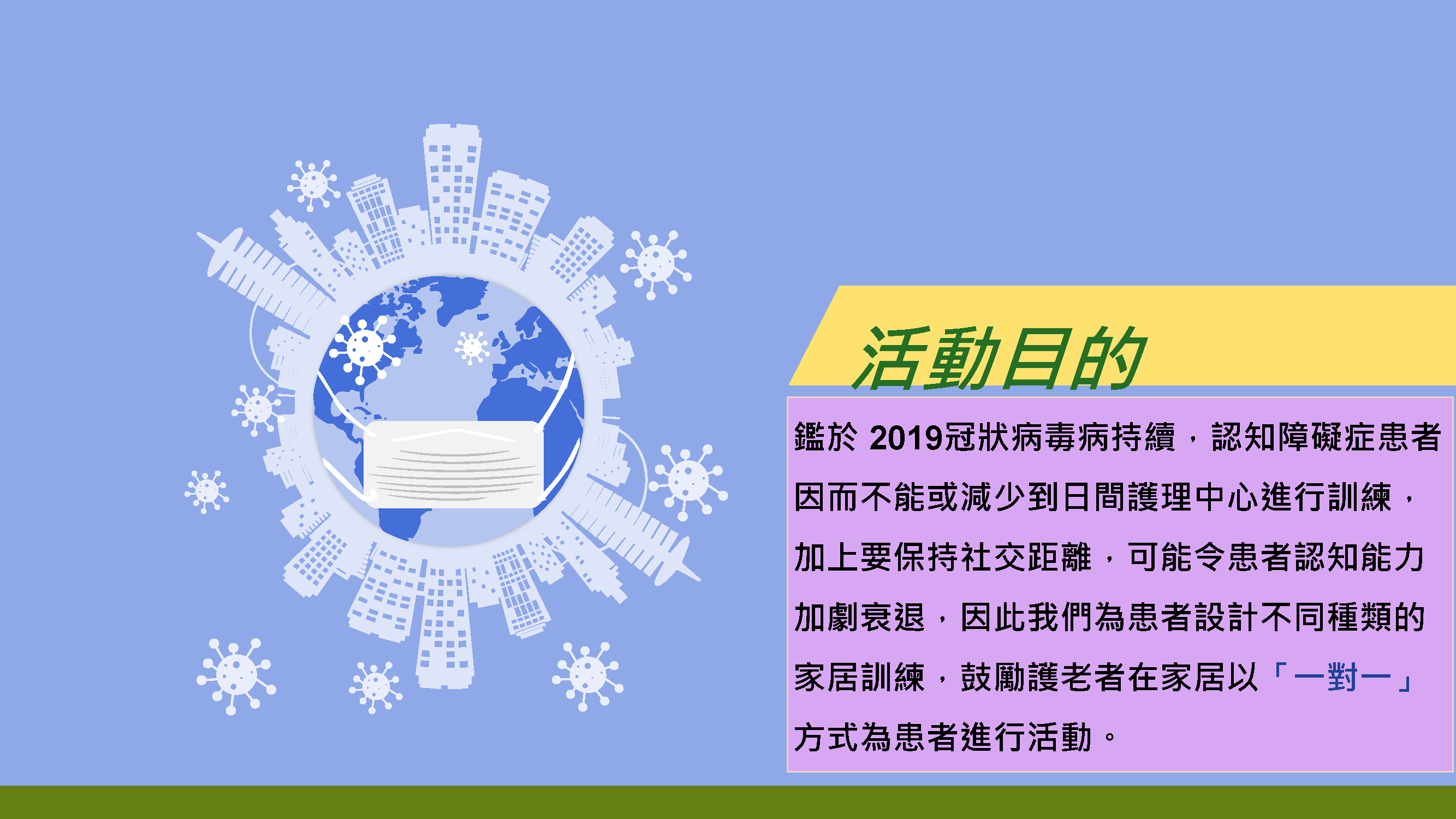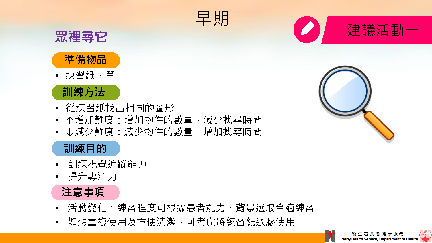 樂在家中篇 適合有認知障礙症長者 “疫”境同行 [pptx / pdf] 衞生署長者健康服務職業治療師為早、中、晚期認知障礙症患者設計了9個適合家居訓練的活動,鼓勵護老者在疫情期間在家中為患者進行活動。目的是讓患者在保持社交距離時,仍能感受活動樂趣,並接受適當認知和感官刺激,減慢認知能力衰退。 活動目的 [pptx / pdf] 注意事項 [pptx / pdf] 早期 [pptx / pdf] 練習紙: 眾裡尋它:程度一 眾裡尋它:程度二 眾裡尋它:程度三 有數得計 連連看:練習一 連連看:練習二 連連看:練習三 中期 [pptx / pdf] 練習紙: 細想當年情:火水爐 細想當年情:婚嫁物品 細想當年情:算盤 懷舊小食對對碰:小食名稱 懷舊小食對對碰:程度一 懷舊小食對對碰:程度二 懷舊小食對對碰:程度三 晚期 [pptx / pdf]